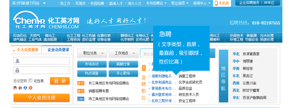 急聘區(qū)位于首屏導(dǎo)航下方位置顯著,極大吸引求職者注意力及對招聘位置的關(guān)注度,有效解決企業(yè)緊急招聘問題。